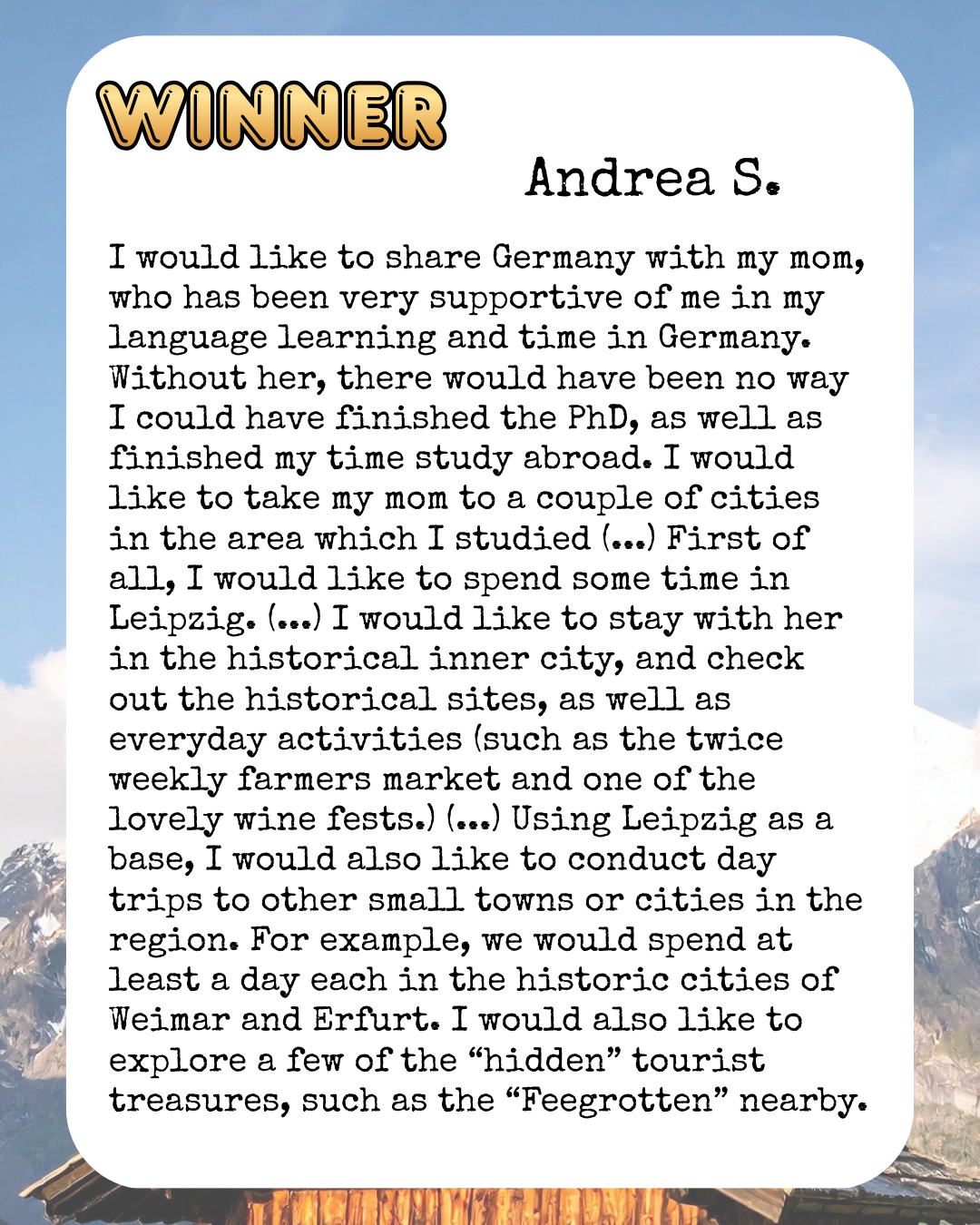 We are sure that our two winners and their loved ones will have an unforgettable time in Germany in 2026! They have been notified already and will each receive two Premium Economy round-trip tickets to Germany, courtesy of Condor Airlines.